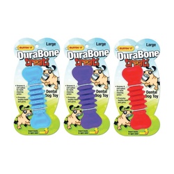 Includes grooves and soft spikes for teeth cleaning action. Promotes healthy teeth and gums. Insert treat in open ends. Comes in assorted colors blue, purple and red.