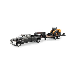 Playtime possibilities abound with the RAM pickup truck and Case skid loader set. The 1:32 2020 Ram 3500 pickup is all new tooling and features the exceptional detail you have come to expect from TOMY. The black pickup features a detachable gooseneck trailer and a SV340B Skid Loader that can be easily loaded and unloaded using the movable trailer ramps. Additional features include a working truck tailgate, movable boom and bucket on the skid loader and a working trailer stand. Recommended for ages 3+.