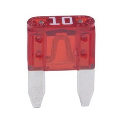 Bussmann Blade Fuse, 32 VAC/VDC, 10 A, 1 kA Interrupt Rating, Blade Terminal, Holder Mounting, Polyamide Body, Red, 0.43 in Width, -40 to 80 deg C, Additional Information: 85% Non-Condensing Relative Humidity, Zinc Element, Zinc Terminal