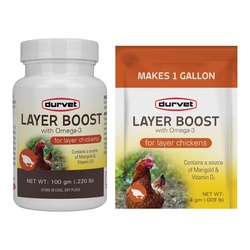 Durvet Layer Boost, 100 g Net Content, Ingredient: Maltodextrin, Sodium Bicarbonate, Salt, Dried Aspergillus Oryzae Fermentation Extract, Potassium Chloride, Dried Enterococcus Faecium Fermentation Product, Dried Lactobacillus Acidophilus Fermentation Product, Ascorbic Acid, Vitamin A Supplement, Niacin Supplement, Vitamin D3 Supplement, Riboflavin Supplement, Vitamin E Supplement, Flax Seed Meal, Thiamine Hydrochloride, Vitamin B12 Supplement, Tagetes (Marigold)
