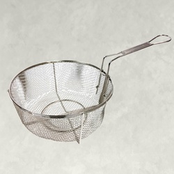 The 12 x 5-1/2 in basket supports large size fillets, while the handle keeps the cook at a safe distance from hot oil. The wire mesh basket with drain hook rapidly drains cooking oil away from fried fish, chicken, shrimp, onion rings, hushpuppies, and fries. When cooking and clean-up are complete, the handle folds for easy storage.