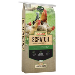 Co-op Feeds two-grain scratch is a blend of premium, cleaned corn and wheat. It is an excellent source of supplemental energy for growth, development and egg production. Coarse grains encourage natural foraging behaviors. Added vegetable oil promotes healthy feather and skin condition. This is not a complete feed, it is designed to be fed as a supplement to a complete ration. Do not include at more than 10% of total ration.