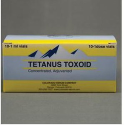 This product has been shown to be effective for the vaccination of healthy horses, cattle, sheep, goats and swine against tetanus. This product was licensed prior to the requirement to establish a minimum age for use. The duration of immunity is unknown. For more information regarding efficacy and safety data. Prepared by detoxifying tetanus toxin in such a manner as to allow the antigenic properties to remain intact. Product is purified, concentrated and adjuvant to provide a low dose effective immunizing agent. Each serial is tested for purity, safety and potency in accordance with USDA requirements. Tetanus is caused by a neurotoxin produced by growth of clostridium tetani, an anaerobic (lives without air) microorganism, in necrotic tissue. Affected animals become stiff, have difficulty swallowing and have an increased pulse rate. Breathing is labored. Spasmodic contractions of the muscular system occur, such as contracting muscles of the jaw. Thus, the term lockjaw is often used. Legs and tail are often stiff with abdominal muscles contracted. Tetanus stricken animals may be unusually sensitive to light and heat. Temperature of the animal generally remains normal, elevating only shortly before death. Protective antibody levels usually occur about two weeks after the second injection of the primary immunization Series. In contrast, administration of tetanus antitoxin is recommended for immediate, emergency, passive treatment of exposed animals with unknown vaccination history or with signs of tetanus infection. Refer to product circular for tetanus antitoxin for full information and consult with a veterinarian.