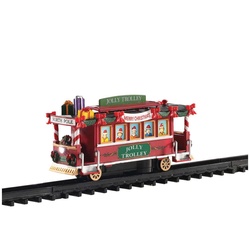 All aboard! Welcome to the Jolly Trolley where townsfolk tour the holiday scenery from the warmth of a decked-out trolley car. Running continuously back and forth on its track, the trolley adds fun and excitement to your Christmas village.